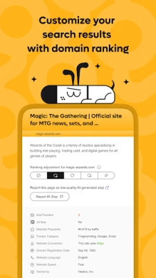 Kagi search app yana baka cikakken ikon sarrafa abin da kake gani. Za ka iya kawar da shafukan yanar gizo marasa inganci ko masu jan hankali, tare da ba da fifiko ga waɗanda kake ganin sun fi amfani. Da alamar garkuwar mu, zaku iya sarrafa sakamakonku yadda kuke so. Har ma zaku iya daidaita inda hanyoyin haɗi ke kai ku, misali, mayar da duk hanyoyin "reddit" zuwa "old.reddit". Idan kana da ƙwarewar fasaha, akwai damar loda takardun CSS naka don ba da salo na musamman ga bincikenku! Bugu da ƙari, tare da "Lenses" na Kagi, zaku iya zurfafa bincikenku. Tace sakamako ta hanyar littattafan kimiyya, shafukan yanar gizo da kuke so, ko batutuwa masu mahimmanci. Akwai "Lenses" da aka gina, kamar "Forums", "Academic", da "Programming", kuma kuna da damar ƙirƙirar taku na musamman.
