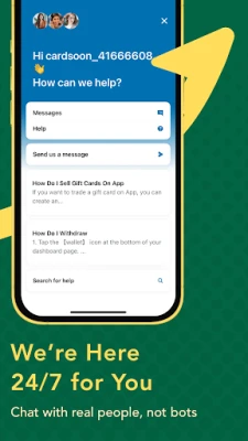 Ba za a taɓa barin ku a baya ba tare da Cardsoon ba. Tawagar goyon bayan abokan cinikinmu ta musamman tana shirye dare da rana, awanni 24 a rana, kwana bakwai a mako, don ba ku dukkan taimakon da kuke buƙata. Ko kuna da tambaya ko kuma kuna fuskantar wata matsala, muna nan don tabbatar da an warware ta cikin sauri da inganci. Shiga cikin babban iyali na masu amfani da Cardsoon a yau kuma ku fara jin daɗin sauƙin juya gift cards ɗinku zuwa kuɗi mai amfani, tare da cikakken goyon baya da amana.
