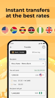 Aika kuɗi ga masoyanka a Nijeriya, Ghana, Uganda, da sauran ƙasashen Afirka kai tsaye, ta hanyar asusun banki ko na wayar hannu. Ko kai mai zaman kanka ne, mai aiki daga gida, mai ƙirƙirar abun ciki, ko ɗan kasuwa, Cleva yana ba ka damar karɓar biyan kuɗi na USD daga ma'aikata ko abokan ciniki ba tare da wata wahala ba. Hakanan, za ka iya karɓar USDT ko USDC cikin walat ɗinka na Cleva cikin mintuna kaɗan. Musayar kuɗi a mafi kyawun farashi mai gasa, kuma mafi kyau duka, ba tare da biyan kuɗin musaya ba. Yi amfani da katin USD na Cleva don biyan kuɗi na duniya, sayayya ta yanar gizo, ko biyan kuɗi na biyan kuɗi a duk inda kake.