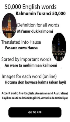 Bugu da ƙari, kowane kalma yana zuwa da cikakken bayani da kuma misalai masu amfani, suna ba ka damar ganin yadda ake amfani da kalmar a cikin jimla. Don tabbatar da furucin daidai, "Kalmomin turanci dubu 50 + hoto" yana ba da damar sauraron kalmomi da lafazi daban-daban: na Amurka, na Australiya, da na Biritaniya. Wannan fasalin yana da matuƙar muhimmanci ga duk mai son gane bambancin furucin Ingilishi na duniya. Kuma ba a nan aka tsaya ba, wannan kayan aiki mai ƙarfi yana goyon bayan harsuna sama da ɗari, yana mai da shi mai sauƙin amfani ga masu koyo daga ko'ina a duniya.