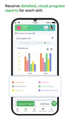 Cikin Kyna English, ana samun damar yin koyo mai inganci da mu'amala kai tsaye da malamai masu takaddun shaida na ƙasa da ƙasa. Manhajar tana sauƙaƙa wa masu koyo bin diddigin jadawalin karatu da ayyukan gida, tare da fahimtar ci gaban su da sakamakon su a fili. Rahotanni masu hoto dalla-dalla suna nuna ci gaba a kowace ƙwarewar turanci. Yana ba da damar haɗuwa da ƙungiyar tallafi a kowane lokaci, ko'ina, da kuma karɓar sanarwa daga Kyna English cikin sauƙi. Wannan tsari mai dacewa yana ba da damar yin karatu a duk lokacin da aka so kuma a duk inda aka so, yana gina tushe mai ƙarfi na turanci da haɓaka dukkan ƙwarewa gabaɗaya, wanda hakan zai inganta damar sadarwa da faɗaɗa hanyoyin aiki.