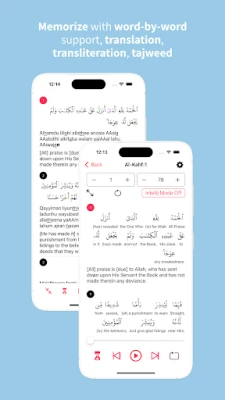*Easy Quran Memorizer* ya zo da manyan fasalulluka da aka tsara don biyan bukatunka na haddacewa da bitar Alkur'ani. Zaka iya zaɓar haddacewa aya-aya, ko zaɓin jere-jere na ayoyi don mai da hankali kan takamaiman sassa. Manhajar tana ba da damar maimaita aya guda ko kuma maimaitawa a cikin jere-jere na surori, tare da fasalin ƙara lokacin jira tsakanin ayoyi don zurfafa tunani. Haka kuma, akwai shafuka da fasalulluka na musamman da aka keɓe don buƙatun muraja'a, yana mai taimaka maka wajen tabbatar da ilimin da ka samu ba tare da wahala ba.